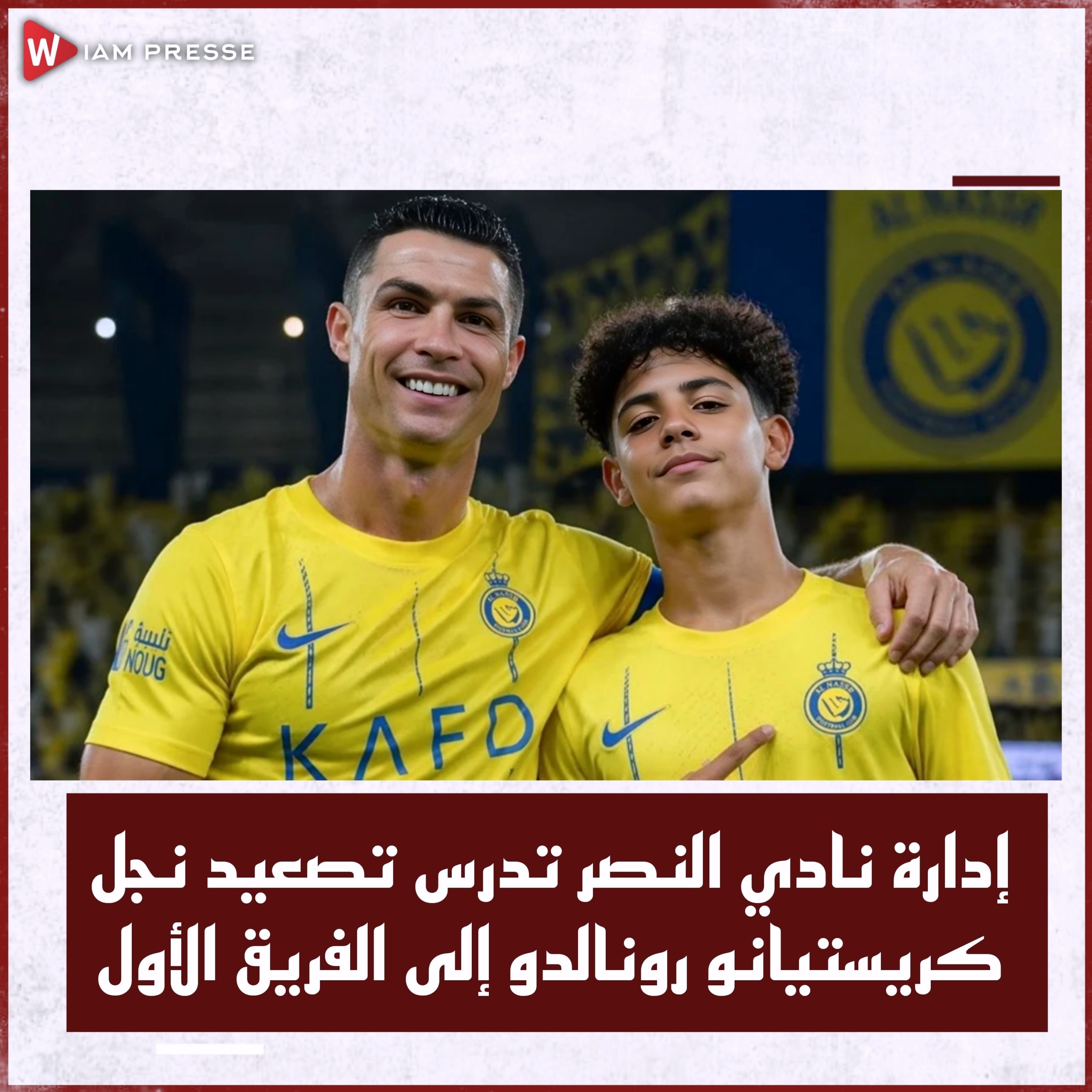 تدرس إدارة نادي النصر خطوة مميزة تتمثل في إمكانية تصعيد نجل النجم البرتغالي كريستيانو رونالدو إلى صفوف الفريق الأول، في إطار مشروع يجمع بين الطموح الرياضي والبعد التسويقي داخل النادي.